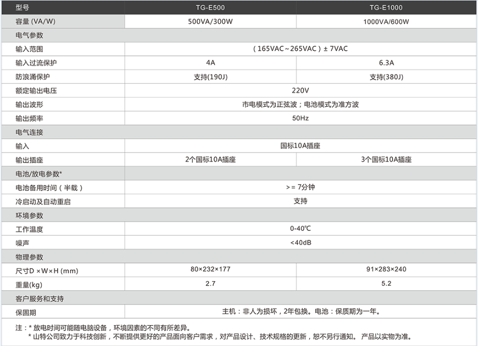 山特后备式TG-E系列UPS---美观时尚的“设备守护神”。TG-E1000/E500 UPS功能强大,集智慧、安全、可靠 于一身,全面提升消费者在产品品质、观感、质感方面的使用体验。这款UPS针对中国市场电力环境优化设计,内置先进的MCU控制单元,使用环保的ABS塑料,做工精美,有效的解决5种常见电力问题:市电断电、电压下陷、浪涌、欠压、过压。TG-E1000/E500 UPS 小身段,大能量,守护个人和办公电脑、商务设备等硬件设备和数据的安全。